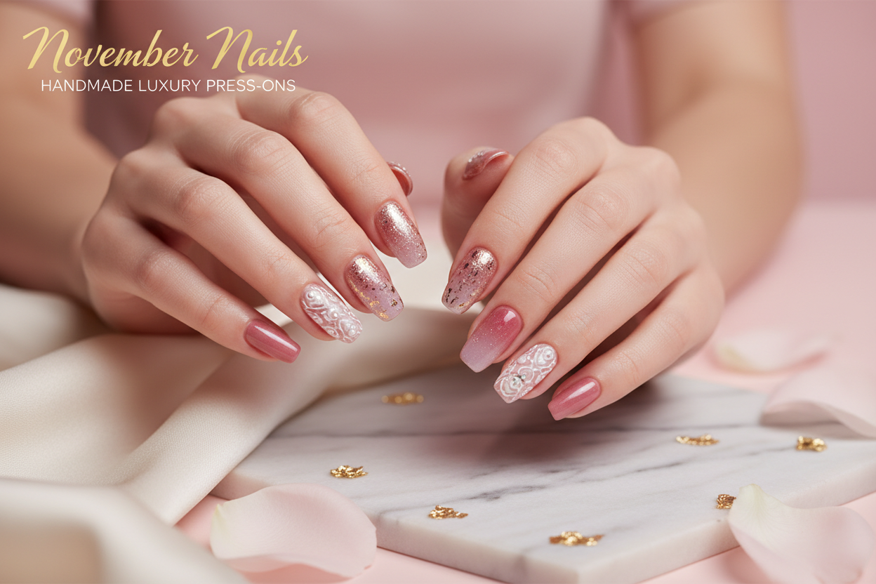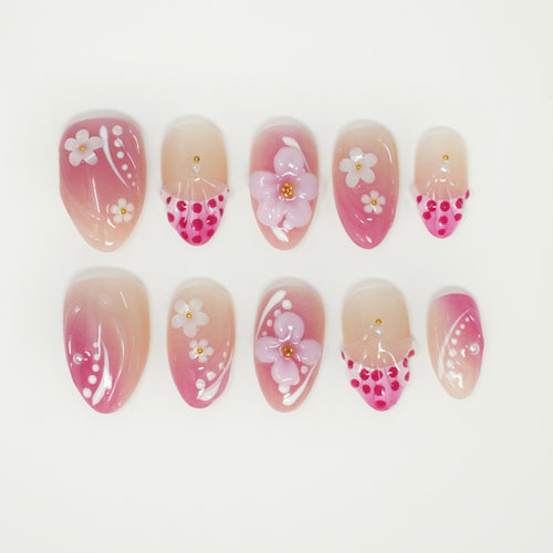 100% Handmade Pink Ombre Floral Press-On Nails | Reusable Gel Nail Art Set