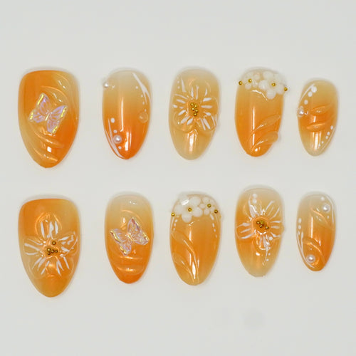 Aesthetic Orange Ombre Press-On Nails | Butterfly & Daisy Art | Reusable Almond Shape Fake Nails